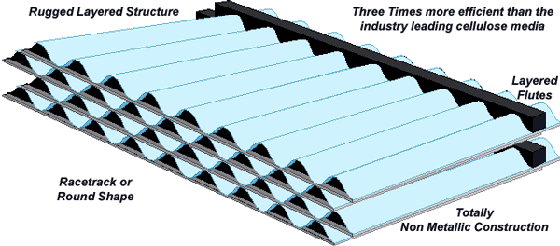 In filters featuring PowerCore technology, the media is formed into flutes. These flutes are layered to give tight, rugged structure to the filter. The fluted channels are alternately sealed allowing air to enter through an open flute and forcing it to exit out an adjacent flute. Dirty air travels in and is filtered in one pass through the media.